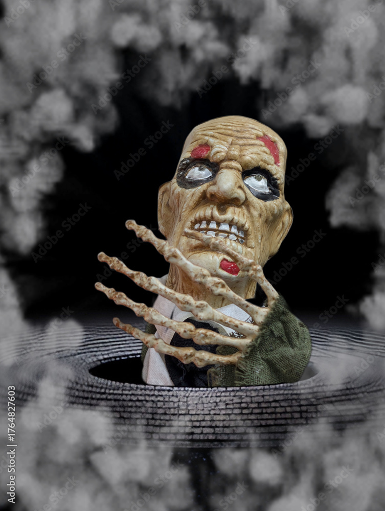 Creepy figure emerging from dark vortex during spooky Halloween decoration setup