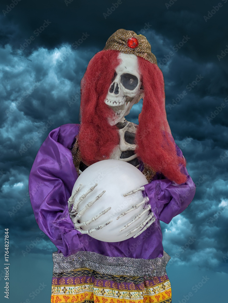 Mystical skeleton fortune teller holding crystal ball in dramatic clouds