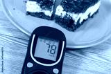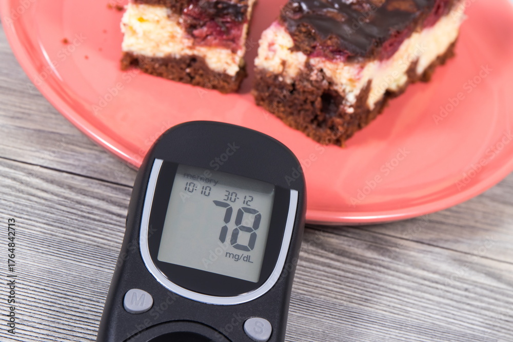 Glucometer with good result of sugar level and fresh cheesecake with cherries and chocolate. Nutrition during diabetes
