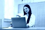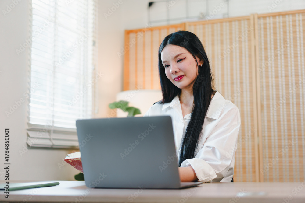 Young woman working on laptop at home office desk with soft natural light and calm expression