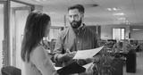 Consulting male wearing green shirt showing printed papers to female in office, with black folder