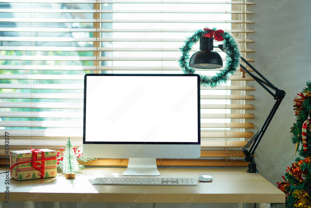 Christmas Desktop Computer Mockup with Blank Screen Surrounded by Festive Workspace Elements