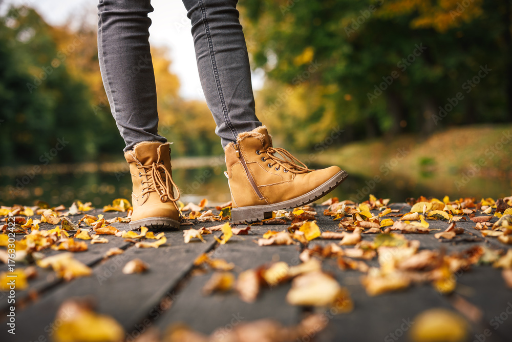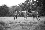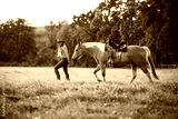 Cowgirl in western clothing leading horse across pasture during autumn sunset. Woman walking with horse, symbolizing slow living and country lifestyle