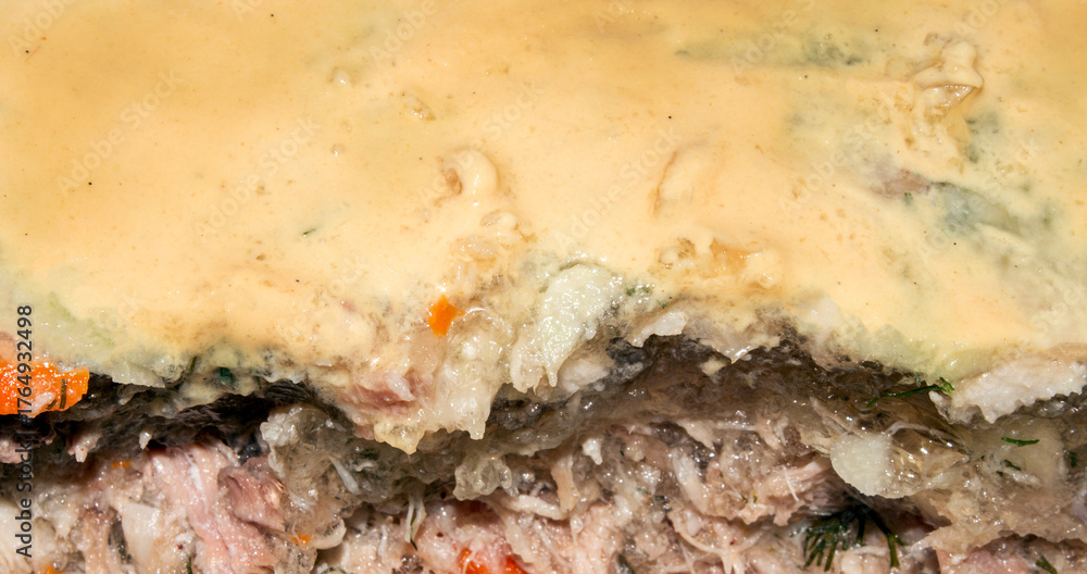 Russian homemade meat jelly.Hearty cold jelly.Meat aspic.Meat base in jelly.Meat snack in the form of jelly.