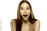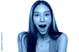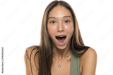 Studio shot of young woman with long brown hair wearing green tank top, smiling with mouth open in surprise, on white background