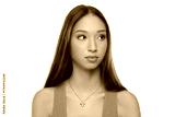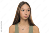 Studio shot of young smiling woman with long brown hair wearing green tank top, eyes closed and calm expression, on white background.