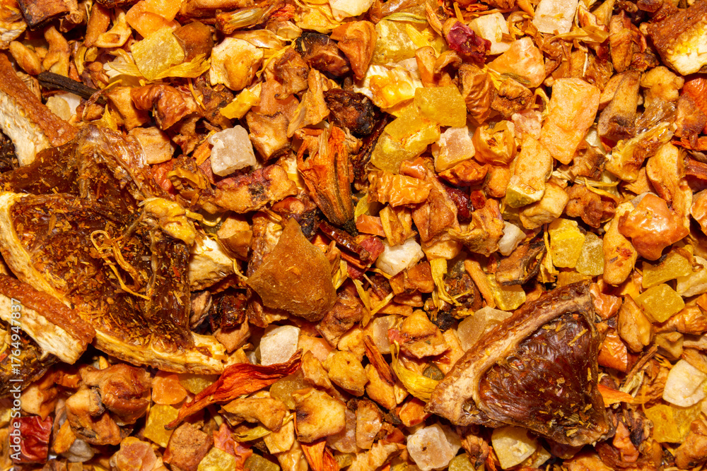 Sea buckthorn tea leaves with pieces of fruit.Sea buckthorn tea with lemon.The texture of sea buckthorn tea.