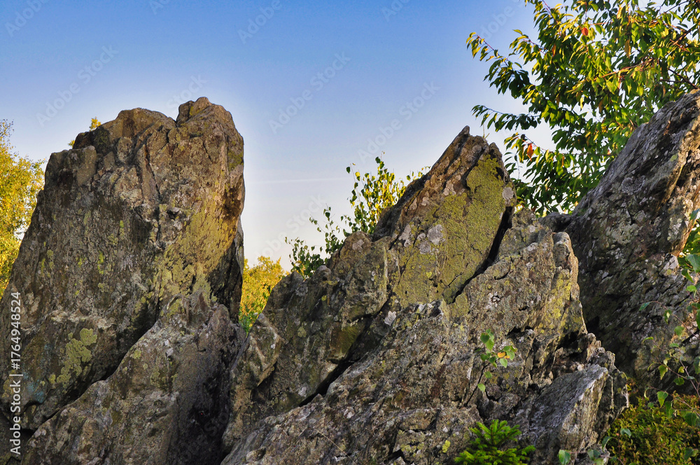 Okole - Góry Kaczawskie. Grupa skał na szczycie góry. Surowe, omszałe formacje skalne pod czystym, błękitnym niebem w spokojnym, plenerowym krajobrazie.