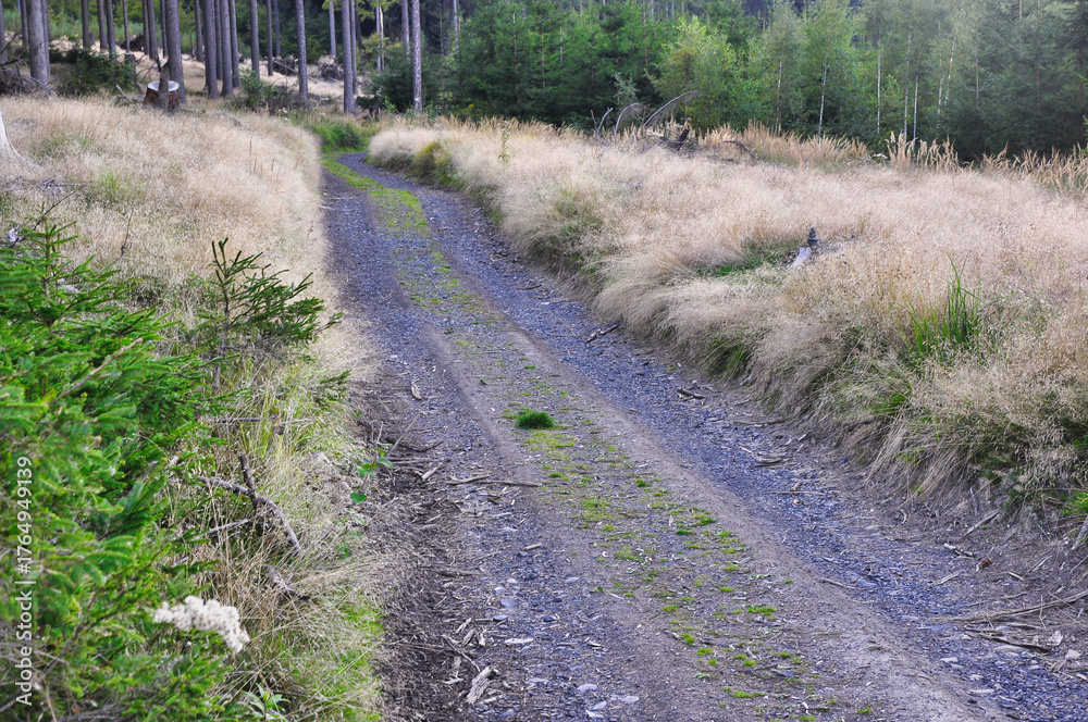 Okole - Góry Kaczawskie. Widoki ze szlaku prowadzącego na szczyt Okole. Kręta, żwirowa ścieżka przez łąkę i świerkowy las w spokojnym górskim krajobrazie.