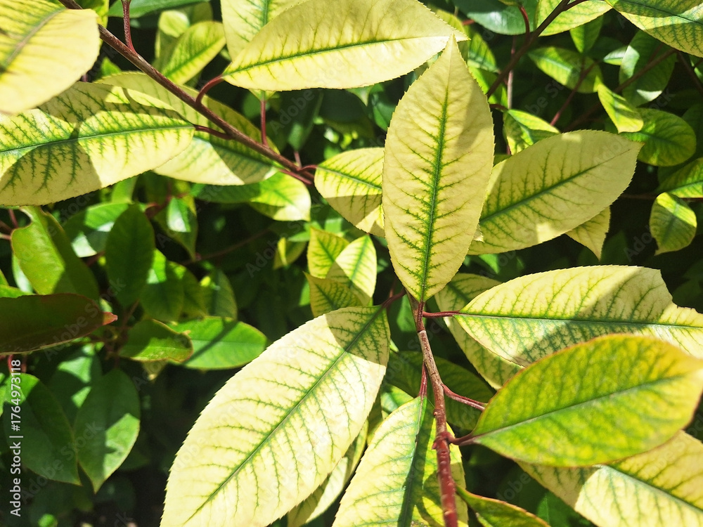 Chlorosis disease on a photinia bush in the form of yellow leaves.