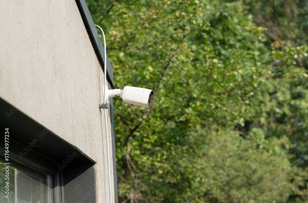 Outdoor security camera. CCTV surveillance camera mounted on modern building wall. Security and safety technology for home or business protection.