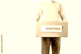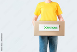 Donation and charity concept with copy space. Person in yellow shirt holding a box with donations label. Volunteering, charity, social help and humanitarian aid concept.