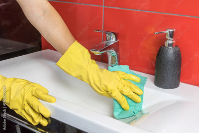 Housework. The housewife in yellow gloves cleans the sink. Horizontally.