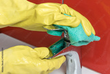 Housework. The housewife is cleaning a faucet in the bathroom closeup. Horizontally.