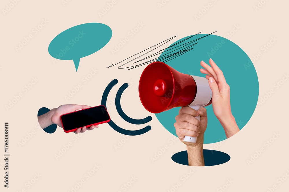 Colorful collage with red megaphone for sale announcement advertising and loud news promotional concept