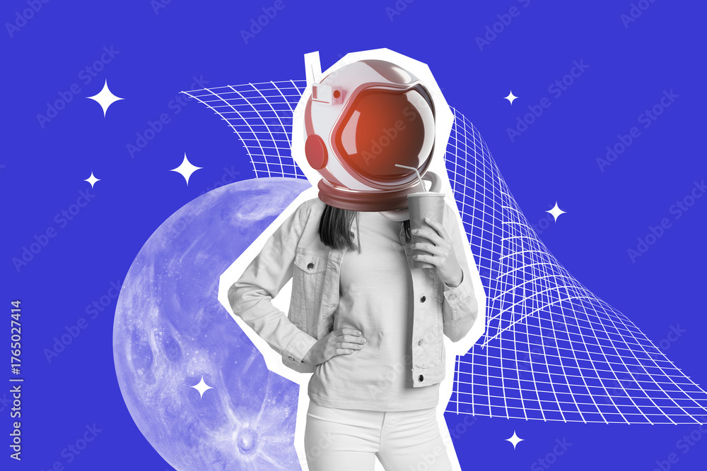 Artwork image poster 3d banner collage of anonym girl wear space helmet drink coffee cup moon planet sleepover night universe