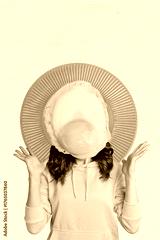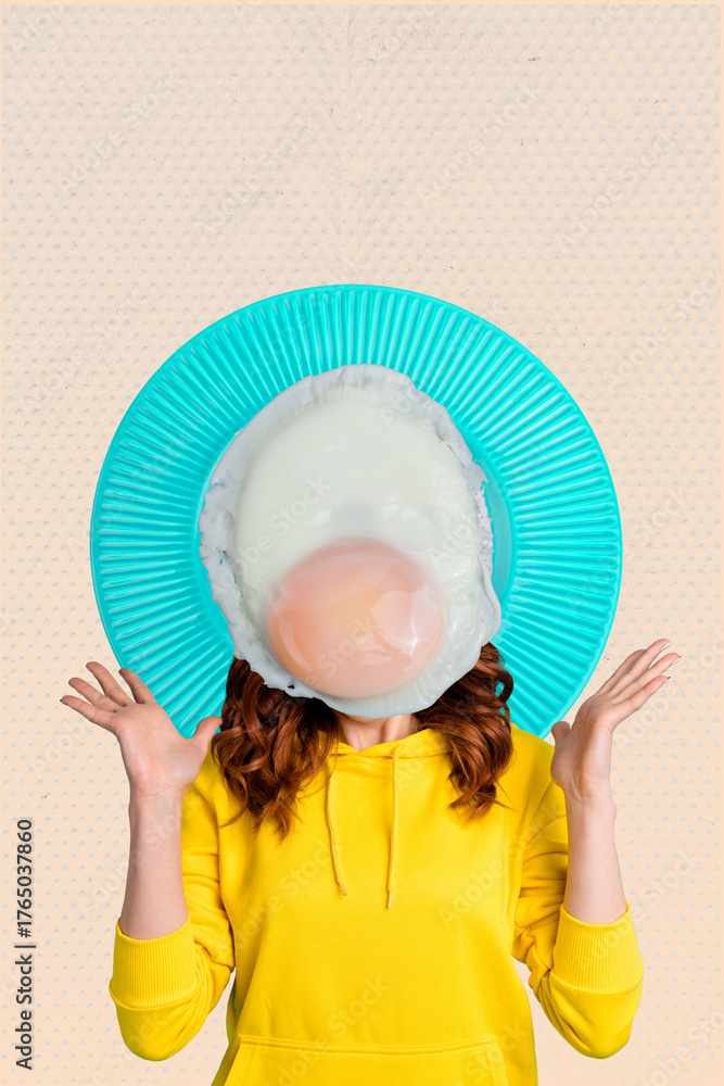 Surreal breakfast-themed collage human head replaced by fried egg plate as funny healthy eating concept