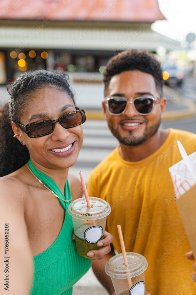 Latino friends smiling and drinking smoothies on a sunny day outdoors