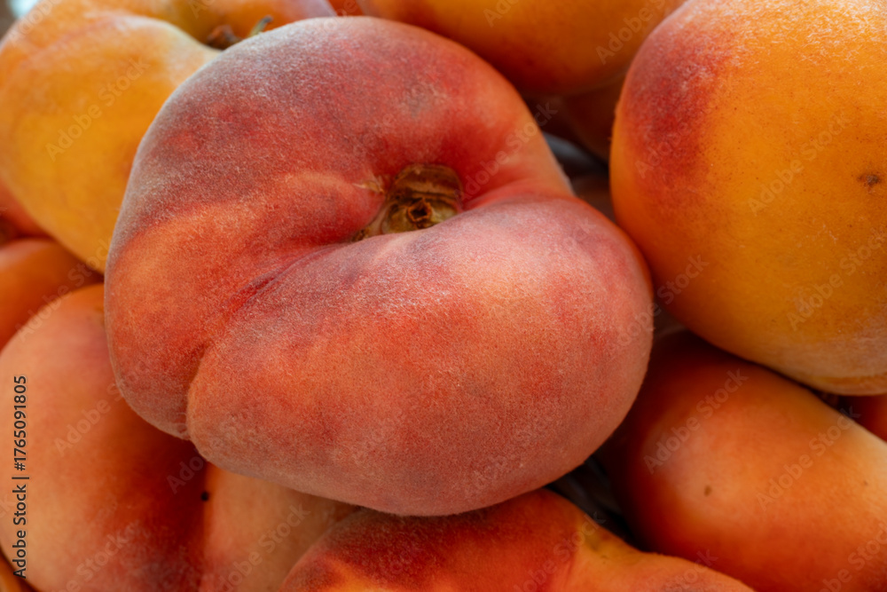 Fresh ripe sweet yellow and flat peaches Prunus persica or doughnut peach or Saturn peach