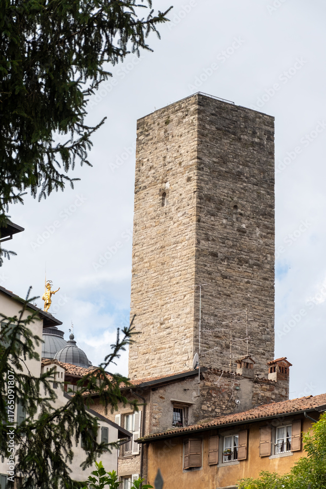 Tourists destination, historical part of Bergamo city, Bergamo Alta with narrow streets, churces, old houses, located on hill with fortress walls, Lombardy, Northern Italy