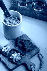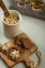 Matured strong british blue cheese stilton keeping in ceramic bowl under wax layer, cheese and whiskey pairing