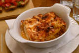 Fresh made and cooked local pasta from Bergamo lasagna ragu pasta served in local restaurant in Bergamo Citta Alta, Lombardy, North of Italy, Italian cuisine