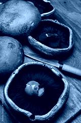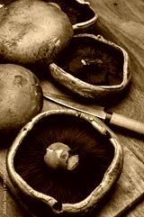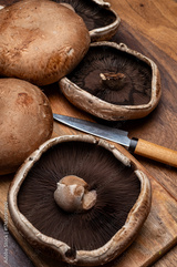 Tasty vegetarian food, large brown champignons Agaricus bisporus portobello mushrooms close up