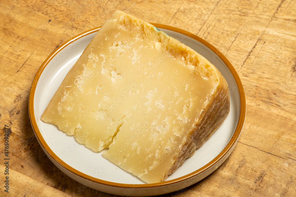 Italian Rodez hard cheese produced with raw cow’s milk, riped 6 months, cheese tasting in Italy