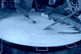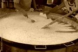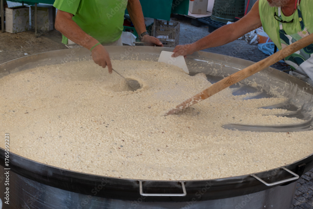 Cooking of risotto with gorgonzola creamy blue cheese on local festival in Gorzonzola city, Lombardy, Italy