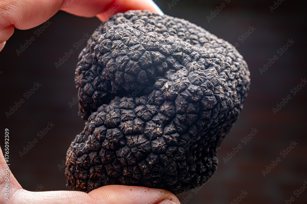 Hand with delicious mushrooms, fresh black summer truffle mushroom from Italy for making truffle dishes with tasty aroma, culinary in France