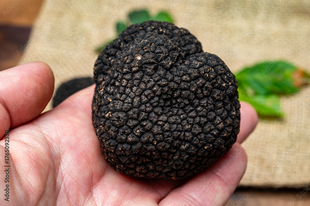 Hand with delicious mushrooms, fresh black summer truffle mushroom from Italy for making truffle dishes with tasty aroma, culinary in France