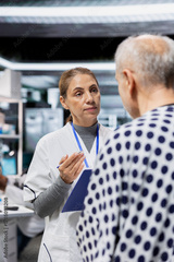 Healthcare specialist examining old patient during a drug trial in laboratory, monitoring treatment outcomes, side effects and dosage response. Advancing biomedicine and health innovation.