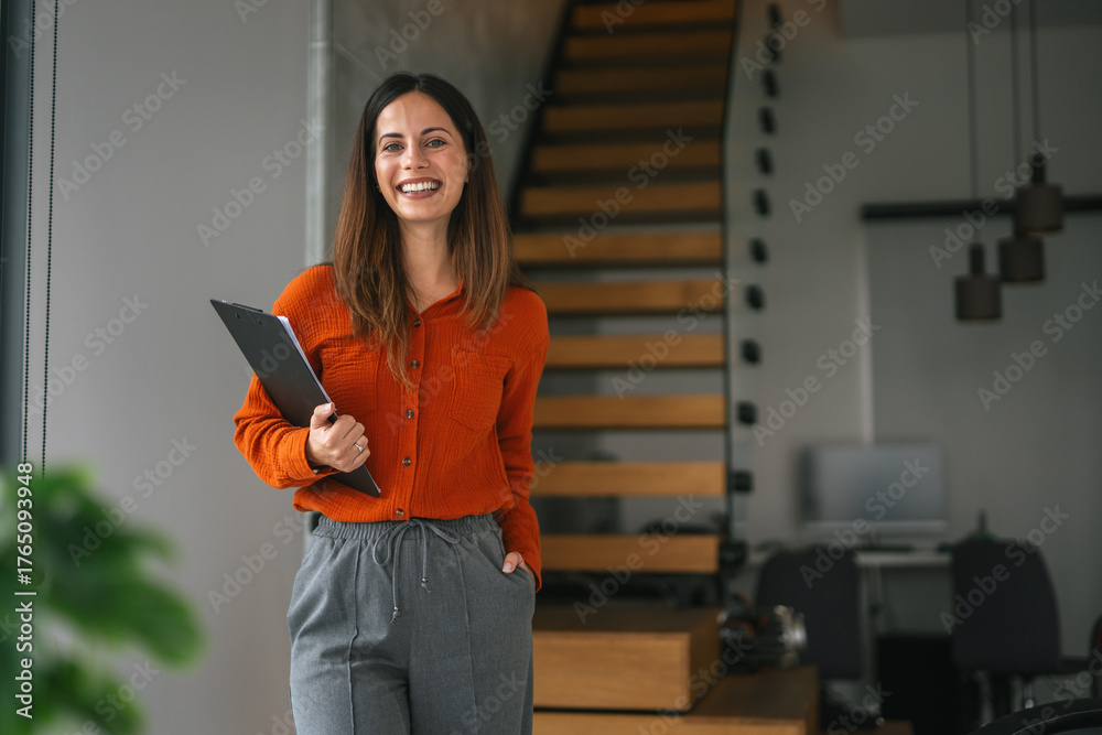 Smiling young businesswoman holding clipboard looking away in modern office