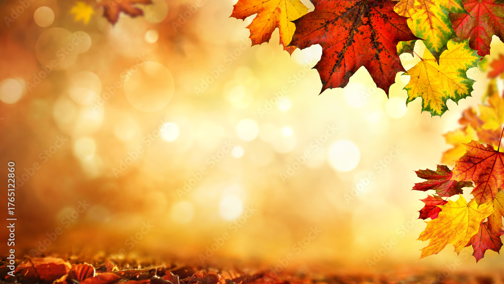 Autumn maple leaves frame a beautiful nature blurred background with glittering highlights and fallen foliage