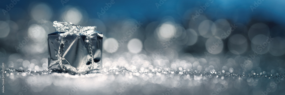 Christmas gift box on glittering silver and blue surface, with shimmering highlights on a wide format banner background