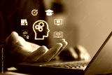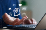 E-learning and knowledge development concept. Person using laptop with digital education icons, representing online learning, skill training, digital education, personal growth, academic achievement.