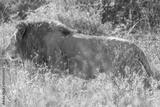 Close encounter with a male lion -Panthera Leo- that is walking across the plains of the Serengeti, Tanzania.