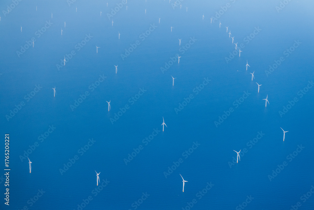 Aerial shot of a modern wind turbine park in the North sea, off the coast of the Netherlands.