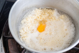 Cooking delicious ramen with egg kitchen food preparation home setting close-up comfort food