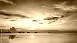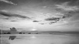 A breathtaking sunset or sunrise illuminates the ocean horizon and serene seascape