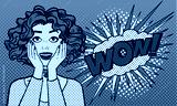 Sincere women's surprise. A girl with an open mouth says WOW. Retro comics style. Pop art. Illustration