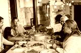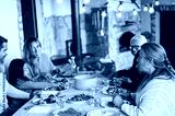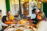 Happy latin family cheering and eating dinner together at home - Winter holidays and Christmas time concept - Main focus on grandmother head