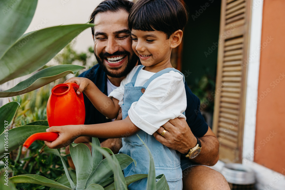 Father and child joyfully watering plants together at home