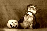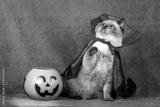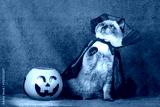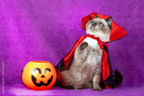 A funny Color point British shorthair cat in a Halloween costume sits near pumpkin basket with light on a violet background. Halloween concept