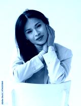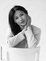 A young woman in a stylish outfit rests her head on her hands while sitting on a chair. Her calm demeanor and striking features create a tranquil atmosphere in the bright, minimalist studio.