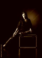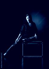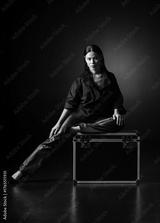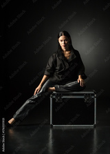 A model showcases a bold look with sleek black clothing while sitting gracefully on a black box. The dimly lit studio highlights her confident pose and sophisticated style.