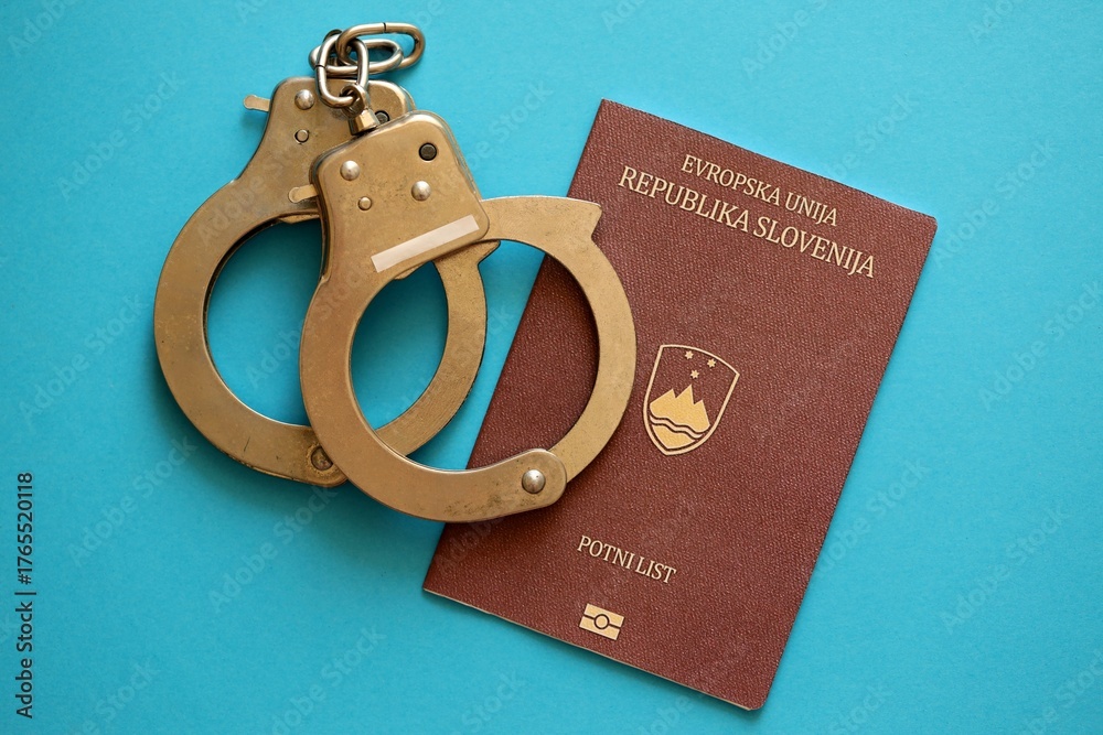 Slovenia passport with police handcuffs on table close up. Criminal level and arrests in Europe concept
