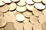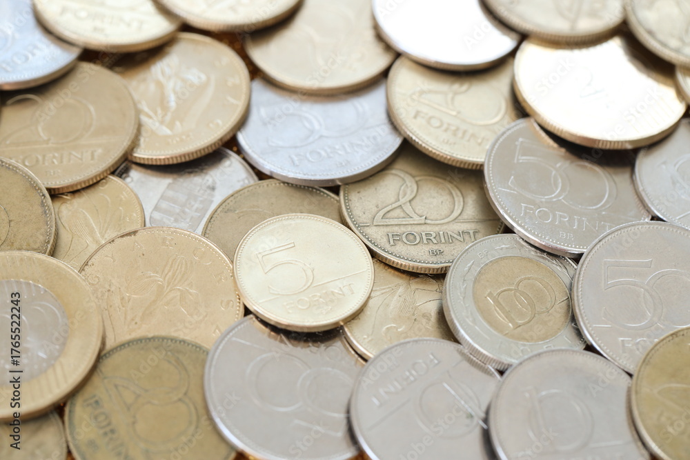 Many forint coins in big pile close up. Forint is an official Hungarian currency instead euro