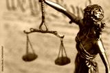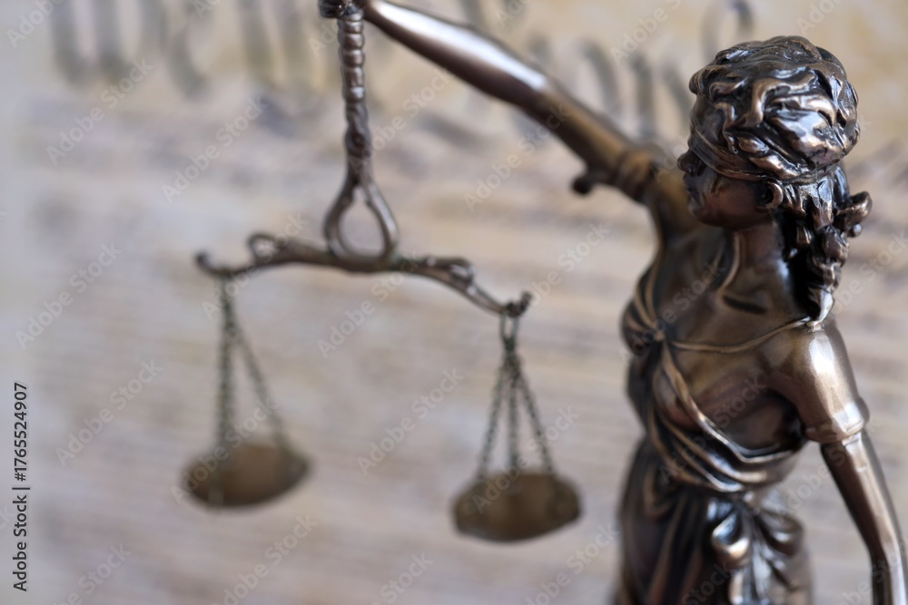 Lady Justice bronze statue on background of US Constitution page close up. Lawsuit and punishment in United States of America