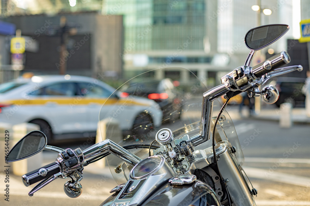 the motobike is parked on a city street, motorcycle front part with gas tank, handlebars, dashboard